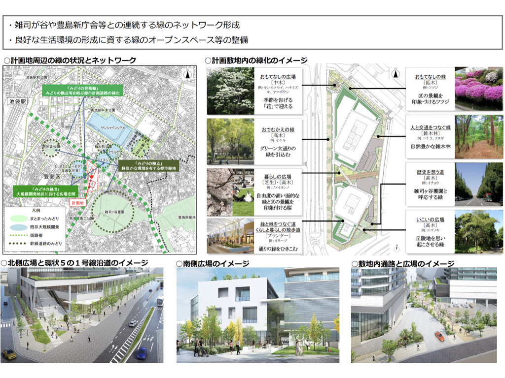 さらに、敷地内には有効空地率約42.9%(敷地面積に対するもので、「屋上緑化を除く有効空地/敷地面積」により算出)に及ぶオープンスペースが確保され地域の緑の拠点となることが考えられる。加えて、北側の「おもてなしの広場(地区広場1:約530m2)」には区の花であるツツジやハナミズキが、中央の「暮らしの広場(地区広場2:約300m2)」にはソメイヨシノ等の高木が植樹される。これらは近接する雑司ヶ谷霊園の緑と連続する「グリーンネットワーク」を構築し、開放的で歩きやすい街並みを生み出すことになる。