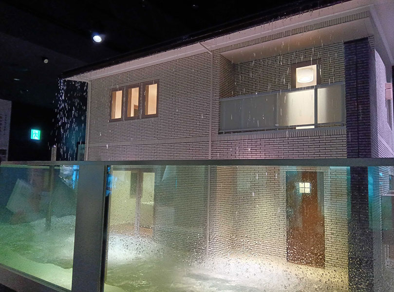 ガラスの大きな水槽の中に1/4スケールの家がある。ボタンを押すと大雨を想定した水が降りかかり、その中に水がどんどん溜まっていく。水は基礎部分を超え、一階の窓枠の上まで達していく。一定の高さに水が達すると、住宅が浮上し浸水を防ぐ様子が見れる。
