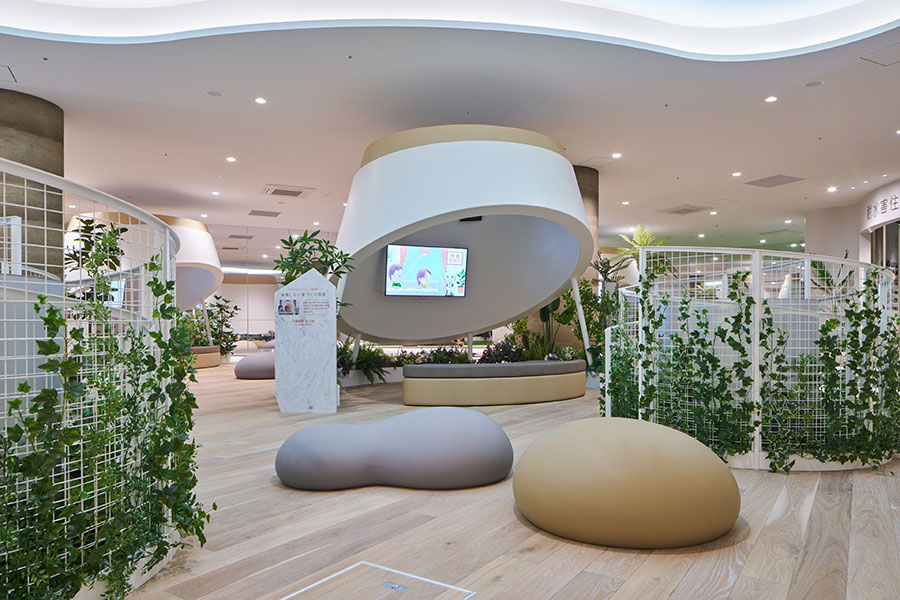 i-GARDENエリアのひとつにパラソルビューイングと呼ばれる傘のようなオブジェの中に設置したモニターで家づくりに関する動画を視聴するコーナーがあります。動画のプログラムには『家づくりの流れ』『ライフタイムコスト』『温熱環境』の 3 種類が視聴でき、短時間で家づくりに必要な知識を楽しく学ぶことができます。