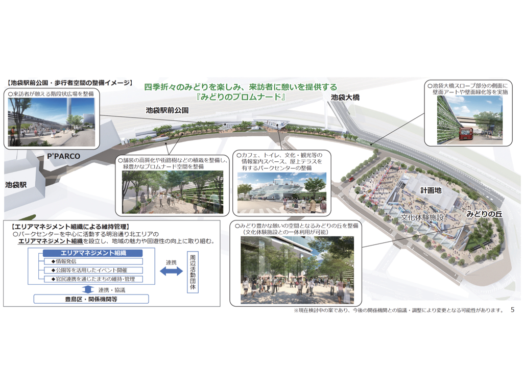 豊島区が掲げる「池袋駅周辺地域まちづくりガイドライン」では、駅を中心とした各エリアを、「ウォーカブル(居心地が良く歩きたくなる)」な空間としてつなぐことが重視されている。東池袋一丁目地区市街地再開発事業における「(仮称)みどりのプロムナード」の整備や、駅周辺の公園(池袋駅前公園、中池袋公園、南池袋公園など)をつなぐグリーンネットワークの形成は、老朽建物の建替えにとどまらず、市街地の骨格そのものを「車中心」から「人中心」へと転換させる取り組みの一つともいえる。