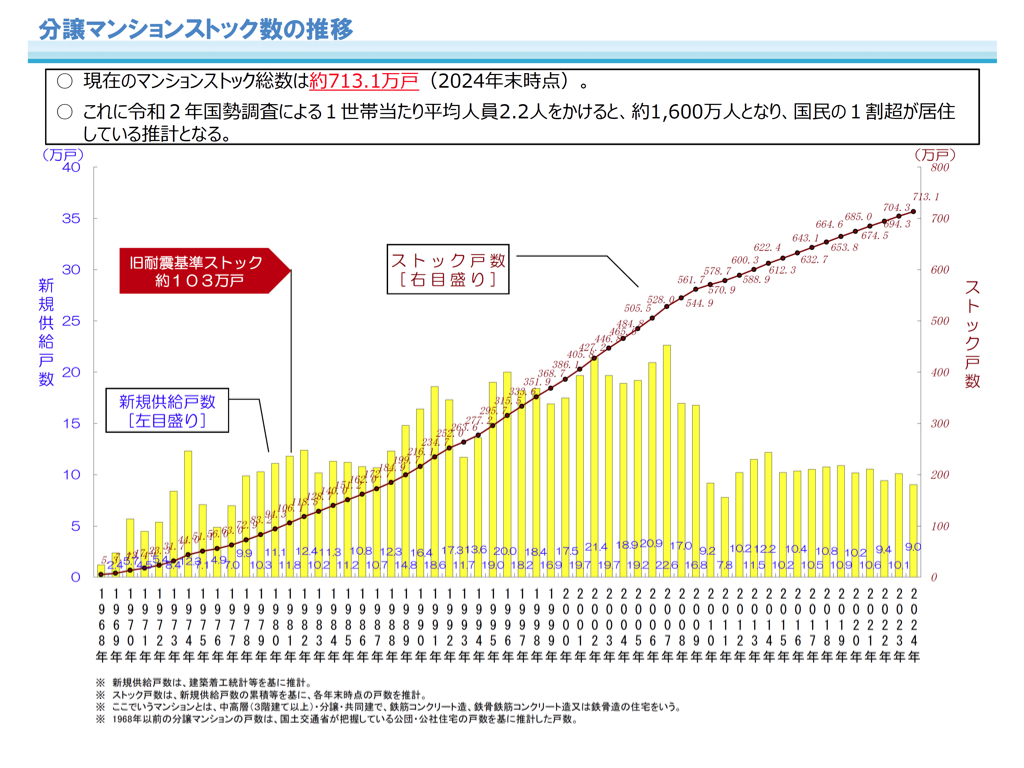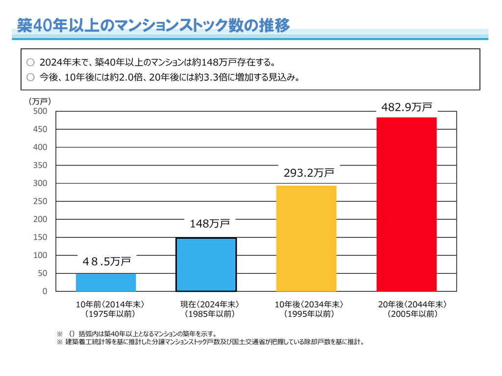 国の推計によると、築40年を超えるマンションストックは2024年末時点で約148万戸に達し、10年後には現在の約2倍へ急増する見込みだ。また、旧耐震基準ストックで見ると、約103万戸に達する(2024年末時点)。こうした中、近年、顕著な傾向を見せているのが「マンション建替円滑化法」に基づく建て替えの増加である。国によると、2025年3月末時点で、累計で323件(約2.6万戸)と増加傾向にある。