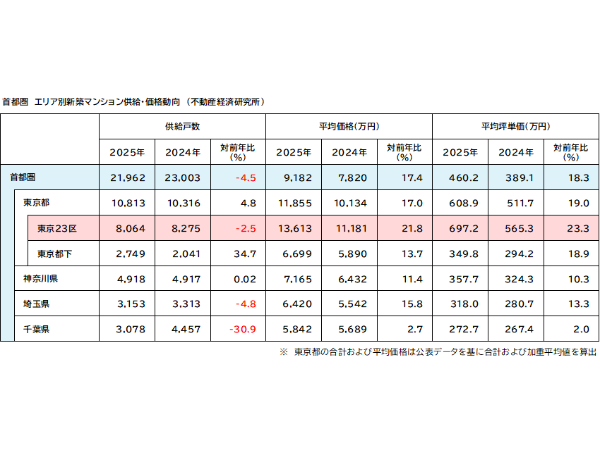 首都圏新築分譲マンション市場動向2025年のまとめを発表(不動産経済研究所)