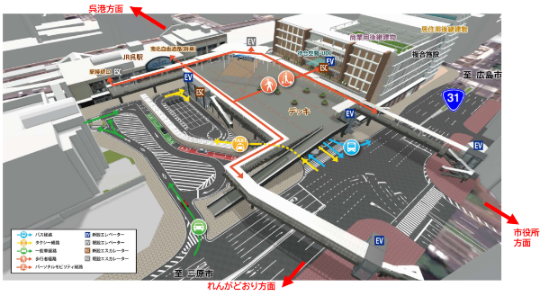 呉駅前再開発では、交通結節点としての機能更新を核に、商業や交流機能を重ね合わせた立体的な駅前空間が整備される。中心となるのは、国の直轄事業として進められるバスロータリーを含む総合交通ターミナルである。