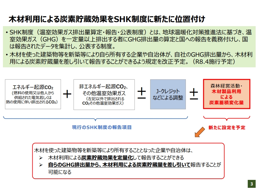2026年4月、温室効果ガス排出量算定・報告・公表制度(SHK制度)が改正される。これまで主にCO2の排出量を測るための制度だったこの仕組みに、木材に固定されたCO2量、いわゆる「炭素貯蔵量」を算定する項目が新たに加わる。