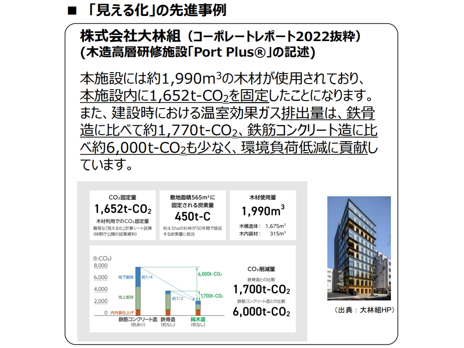 「端的にいって、売買など不動産取引の基盤となる制度にまで結びついているかというと、まだ途上という段階です。今回の改正では、企業が排出したCO2から、“炭素吸収や貯蔵量を増やす努力をした分”を引き算して明記することができます。計算した調整後のCO2排出量や炭素貯蔵量の記載が可能になることで、企業が木材利用に取り組んでいることを有価証券報告書などに定量的に記載できるようになるとは考えています。ただ、建物そのものの価値というよりも、まずは企業価値を高めるところから始まるのではないかというのが、現在の見方です」