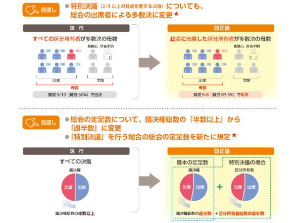 『3.共用部分の変更決議』も強行規定であり、瑕疵による権利侵害やバリアフリー化などの決議要件が「4分の3」から「3分の2」に改正されたことに伴う項目だ。