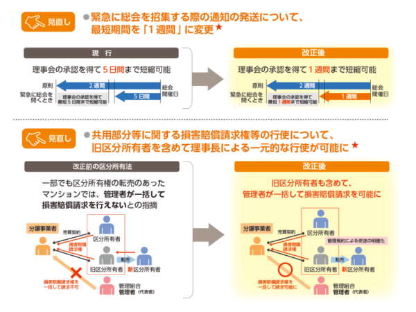 『4.緊急時の招集手続き』も強行規定で、改正前の標準管理規約では緊急に総会を招集する際の通知の発送の最短期間が「5日間」だったが、改正後は「1週間」となっている。