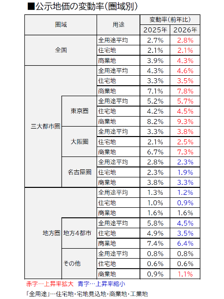 2026年の公示地価は全国・全用途平均で5年連続の上昇となった。上昇率は前年比2.8%と、前年の2.3%からさらに拡大し、バブル崩壊後の1992年以来、34年ぶりの高い伸びとなっている。