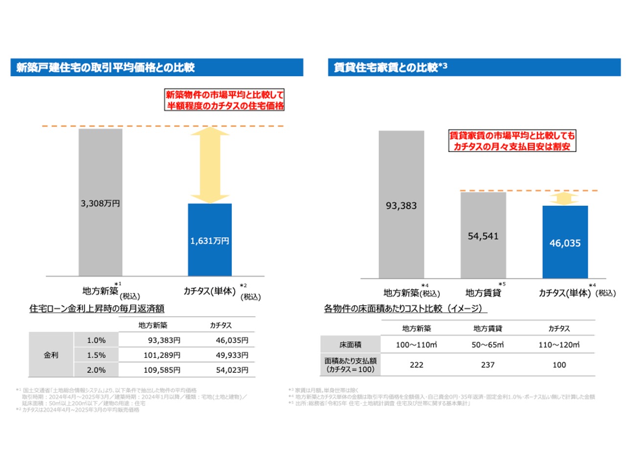カチタスのビジネスモデルの要は、「新築の半額程度」という価格設定にある。同社の2024年度の平均販売価格は1,631万円。地方の新築一戸建ての取引平均が3,308万円(※)であることを考えると、まさに半額程度の水準だ。月々のローン返済額(35年返済・金利1.0%)に換算すると4万6,035円となり、地方の賃貸家賃の平均5万4,541円をも下回る。「家賃を払い続けるなら、持ち家のほうが合理的」という選択肢を、現実的な価格で提示しているのだ。