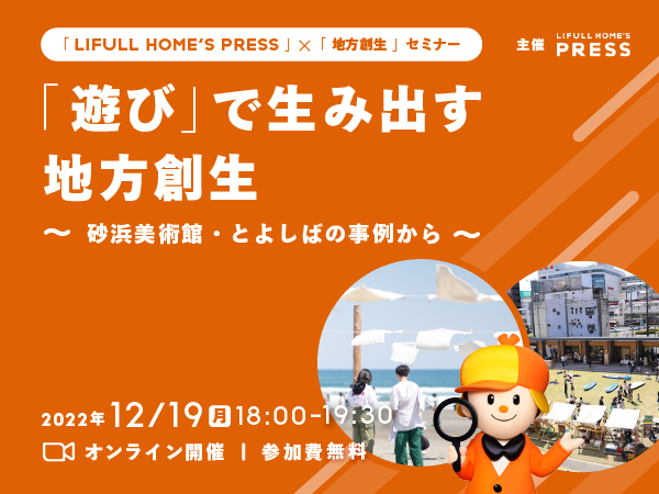 基調の講演は、調査研究レポートの内容をLIFULL HOME'S総研所長の島原万丈さんから。また、各地の「遊び」の事例として、高知県黒潮町の「砂浜美術館」の取組みをNPO砂浜美術館観光部〜Seaside Gallery〜の塩崎草太さんから、また愛知県豊田市「とよしば」の取組みを有限会社ゾープランニング代表取締役の神崎勝さんから、また双方の取材をしていただいた中川寛子さんを交えてのトークセッションをお届けします。