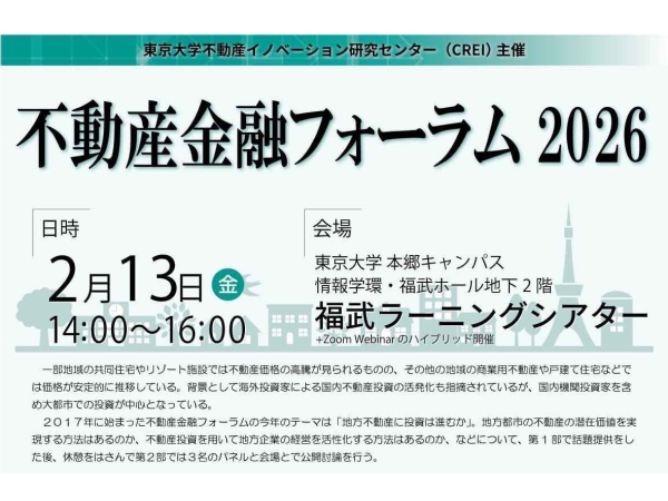 東京大学イノベーション研究センター(CREI)は、2026年2月13日(金)『不動産金融フォーラム2026』を開催する。