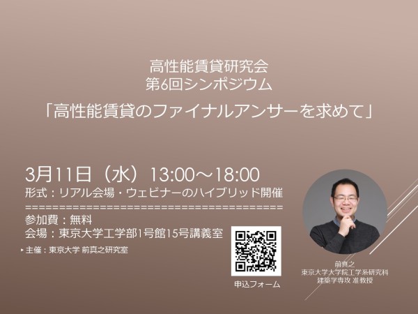 名称:高性能賃貸研究会 第6回シンポジウム「⾼性能賃貸のファイナルアンサーを求めて」