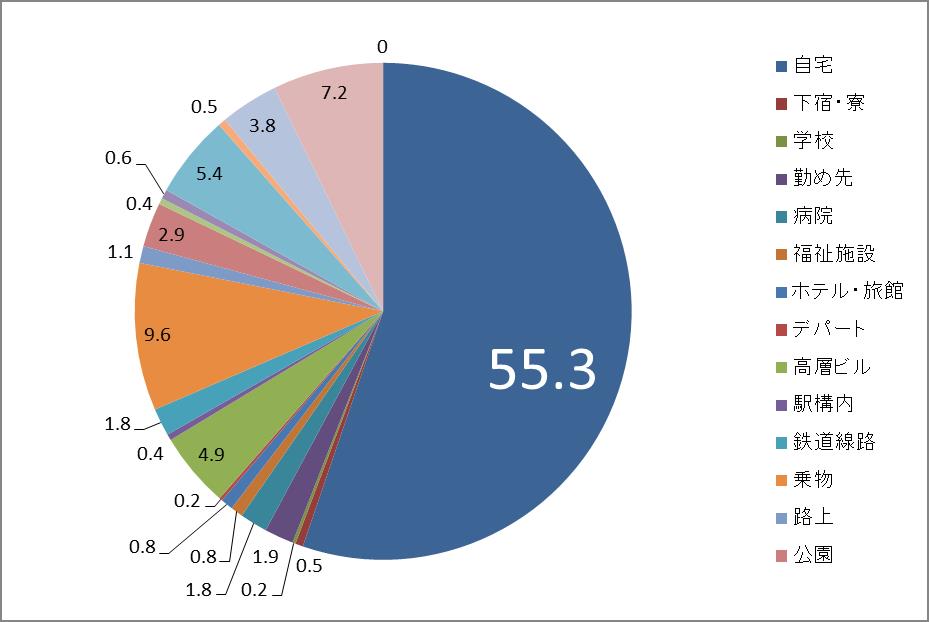 以下の円グラフ(警視庁自殺統計より)は平成22年の自殺場所別の自殺者数の構成割合である。自殺場所の55%は自宅だそうだ。自殺が原因の事故物件は毎年1万5000戸以上増殖し続けていることになる。