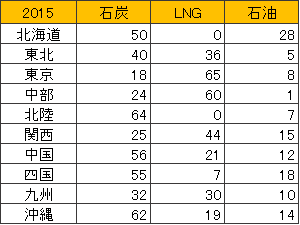 最後の現行基準となっている考え方であるが、石炭、石油、ガスという3つの火力発電方式の全国平均を利用している(通称:火力平均)。それも2003年に省エネ法施行規則で一次エネルギー換算係数が2.71倍と定められて以来、一度も変わっていない。当然ながら14年が経ち発電構成も変わっている。さらに言うと各社毎に発電比率は上表のように大きく異なっている。全国一律であるはずがないのである。