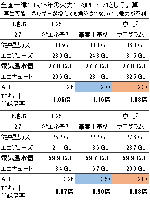 これで見た場合、最も悪いとされる沖縄電力においても2.65と2.71よりは良いことが分かる。北陸電力に至っては水力発電比率が一位の26%にも及ぶことから2.01と現行基準の74%程度の一次エネルギーしか消費しないといったことが読み取れる(ただし、北陸電力のエリアは一世帯当たりの消費電力は非常に多い)。