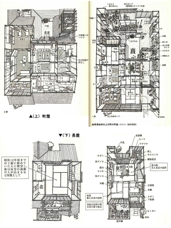 建築の観点から興味深いのは、奉公人のうち営業使用人のいる「店」と、家事使用人のいる「奥」とは、「互いに通路することを禁ぜり」(鴻池家)と空間的に分離されていた点である。