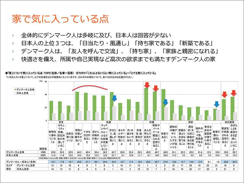 島原:調査データの「家について気に入っている点をデンマークと日本で比較してみると、日本は“日当たり・風通しが良いこと”や“持ち家であること”“新築で購入・建設した”などスペック項目が高いポイントとなっているのですが、デンマークの場合“友人を呼んで交流ができること”や“家族やパートナーと親密になれる空間であること”“自分らしさを表現できる空間になっていること”などに高いポイントがついています。