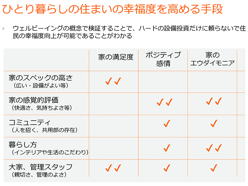 「ひとり暮らしは実は、ストレスは低いが孤独度は高いという結果が出ています。では、孤独の緩衝材は?というと、ポジティブ感情やエウダイモニアが高まる暮らし方、地域社会との緩いつながり、多様性の高い街選び、といったことが調査からみえてきたことです。
