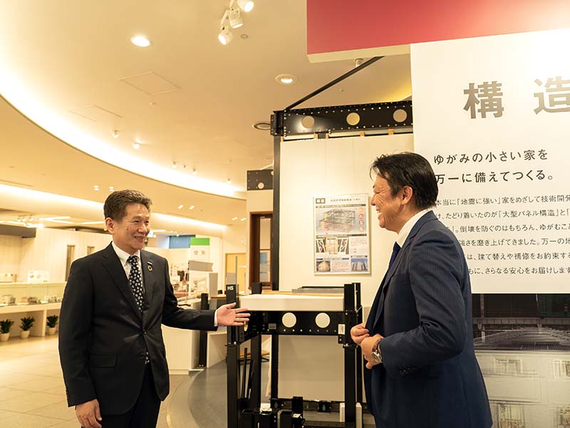 P 井上氏:⽇本は⼤きな地震がたびたび起こる国です。今までも残念なことに、阪神淡路⼤震災や東⽇本⼤震災などをはじめとする⼤地震が数多く起こりました。しかし、パナソニック ホームズの家は、過去の地震で⼀棟も倒壊していない実績があります。常にお客様の生命を守ることが第⼀と考えている当社が⾃負できる強い家なんです。