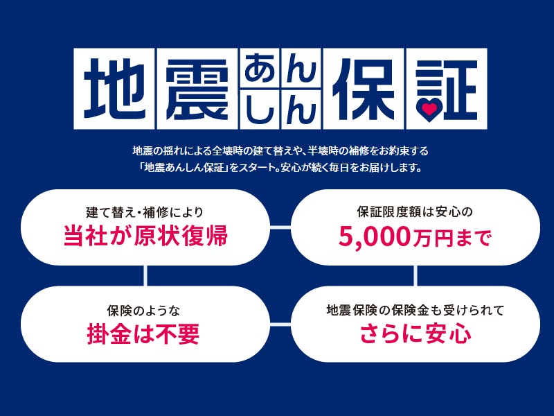 加えて、住まいはお客様の資産ですから、それを守るということも必要です。これからも「⾸都直下地震」や「南海トラフ地震」など、いつどこで⼤きな地震が起きてもおかしくないといわれています。そのため、万一地震で住まいの全壊・半壊があった場合に当社が建物を原状復帰する独自の制度「地震あんしん保証」も展開しています。