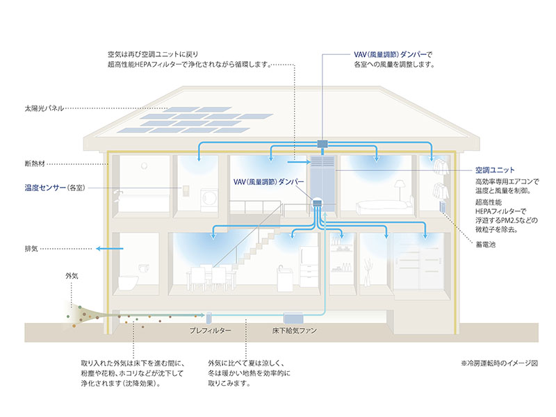 P 井上氏:コロナ禍で注⽬されている「換気」ですが、当社では住まいの全館空調システムとして「エアロハス」を提案しています。これにはパナソニックの換気・空調の技術⼒が⽣かされているのですが、エアロハスはいったん各部屋に吹き出した空気が空調ユニットに戻り、外からの換気空気をミキシングして専⽤エアコンによる空調とHEPAフィルターによる浄化を⾏い、再度、各部屋にきれいな空気を届けるというシステムです。真夏・真冬も、24時間365⽇、家じゅうを安定した温度に保つので、きれいな空気の中で快適に過ごせます。特に今の時世では在宅時間が長くなりますから、その中で本当に健康で安全・快適に⽣活ができるというのが「暮らしやすさ」につながると感じています。
