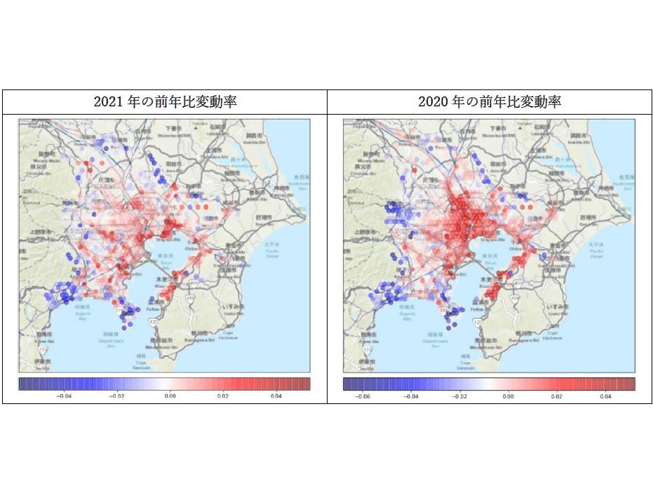 しかし、これらの数値は、「平均値」であり、これらを地図上で見たときの印象とは大きく異なる可能性がある。そこで、一都三県の市街化区域に存する住宅用途の基準地価について、2021年7月1日時点および2020年7月1日時点それぞれの価格に対する前年比変動率について調べてみた。