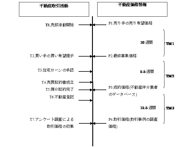 図1では、このような取引過程とデータが入手できる時間間隔を図示化した。まず、市場に初めて売り希望情報(P1)が提示されてから、平均10週間で買い手からオファーがくる(T1-T2)。この段階の価格は最終的な売り希望価格であり、買い手の最初の買い希望価格(P2)となる。さらに、物件調査が完了し、住宅ローンの申請などを含めて、その後の媒介契約が完了するまでに平均で5.5週間が必要になっている(T2-T4)。この段階で、レインズに成約価格登録が行われる(T5)。