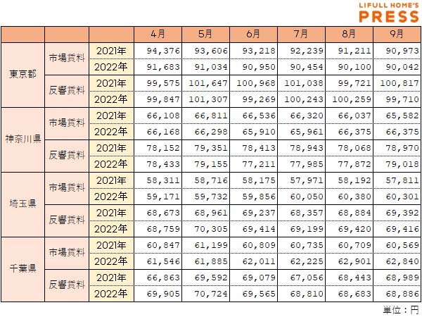 同じく東京都の反響賃料は、4月の9万9,847円から9月には9万9,710円とー0.1%で横ばいとなっていて、賃貸ユーザーの減少傾向に関わらず反響賃料には大きな変化がない。これは都内に居住する上で前提となる生活および交通の利便性を確保しようとすると、やや賃料水準が上振れるためだ。賃料と利便性とはトレードオフの関係にあるから、駅に近く買い物にも移動にも便利な物件の賃料は掲載されている賃貸物件の中では1万円ほど高くなっているということになる。