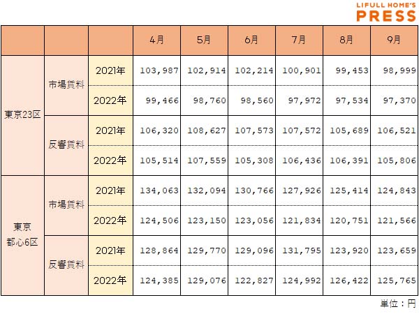 ただし、この間の反響賃料を確認すると、4月は10万5,514円で9月は10万5,806円とほぼ変わっておらず、0.3%の上昇を記録している。つまり、東京23区においては、賃貸ユーザーの減少傾向が見られるためそれが市場賃料に影響しているものの、実際に借り手がつきそうな物件の賃料にまでは影響していない状況にある。今後、賃貸ユーザーの減少傾向がさらに顕著になれば、反響賃料が徐々に下落する可能性が高くなるが、現状ではパイの減少があっても賃料自体の低下にはつながっていないという見方ができる。