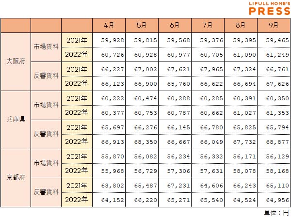 この間の反響賃料の推移は、大阪府で4月の6万6,123円から9月の6万7,626円へと2.3%、金額にして1,503円の上昇を記録している。兵庫県では同じく4月の6万6,913円から9月の6万8,877円へと2.9%の上昇、京都府でも同じく4月の6万4,152円から9月の6万4,956円へと1.3%の上昇が発生しており、賃貸ユーザーが市場賃料の上昇に応じて反響賃料の水準を引き上げていることが明らかだ。