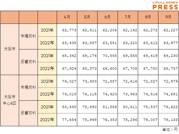 大阪市の市場賃料は2022年4月が6万3,438円なのに対して9月が6万3,977円となっており、0.8%、金額にして539円の上昇だから、横ばいとの見方ができる。それでも9月の市場賃料6万3,977円は対前年比で2.8%上昇しており、賃料水準自体は極めて緩やかに安定的な上昇を示していることになる。