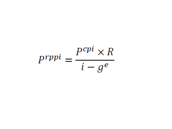 名目住宅価格の長期的変動を最もベーシックな現在価値モデル(PVRモデル)に基づき考えると、住宅の価格は、住宅が生み出す将来にわたる収益の割引現在価値に等しくなると想定される。ここでは住宅価格(P^rppi)、物価指数(P^cpi)、実質家賃(R)、名目金利(i)、名目期待キャピタルゲイン率(g^e)とのあいだに次の長期均衡関係を、次のように仮定することができる。