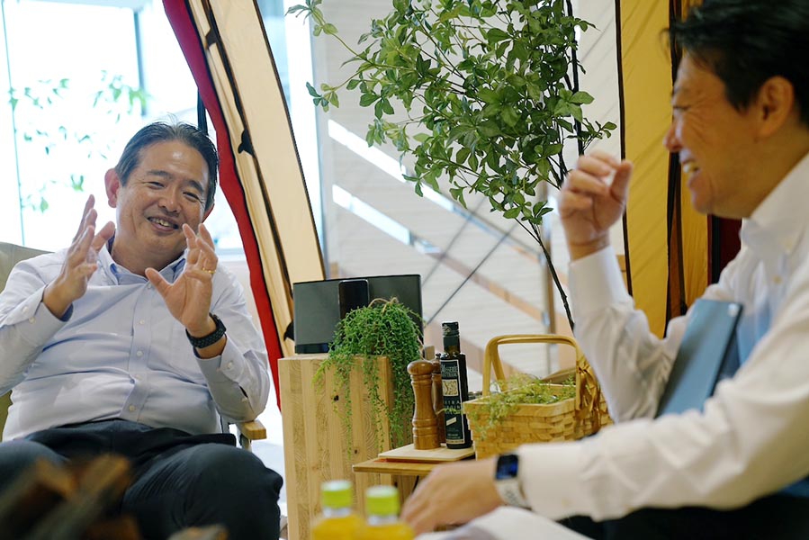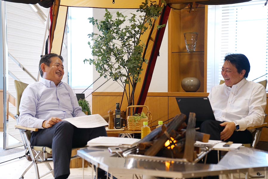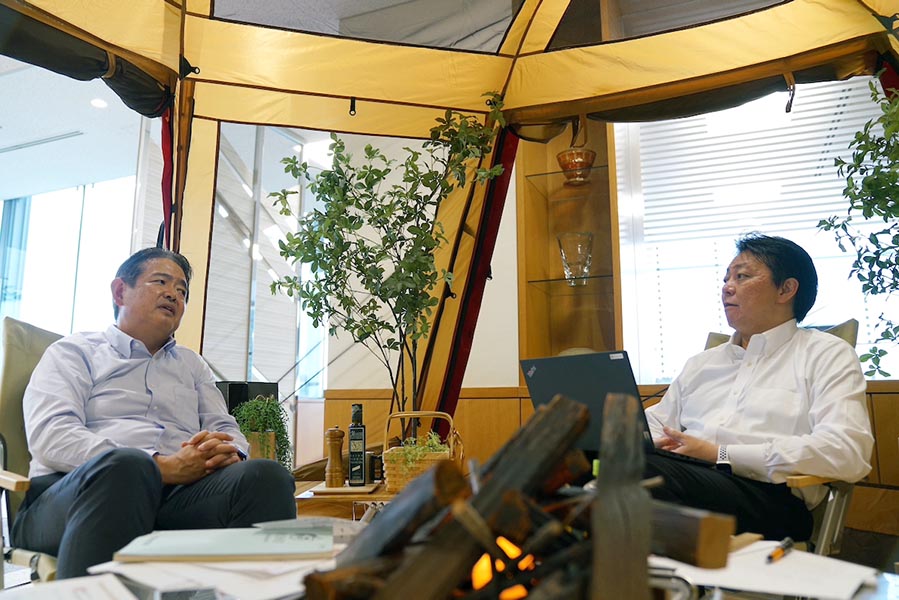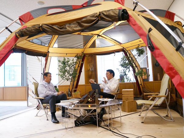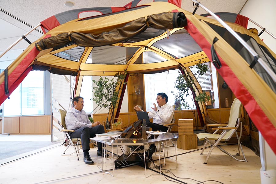 2022年に株式会社スノーピークと「野遊び賃貸プロジェクト」を発足した大東建託の社長室の一角には、アウトドアのような空間にテントがおいてあった。今回はこの場所で、賃貸住宅事業を中心に循環型社会や地方創生など新たな領域を拡げる取組みを、 大東建託株式会社 代表取締役 社長執行役員 竹内 啓氏にお話を伺った。