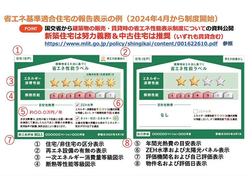 2024年4月から省エネ性能表示制度が開始される。表示対象には、売買だけでなく賃貸も含まれる。新築については 「努力義務」、中古は「推奨」という扱いだが、新築については努力を怠った事業者名が公表されるため、近いうちに義務化に近い形になる可能性がある。