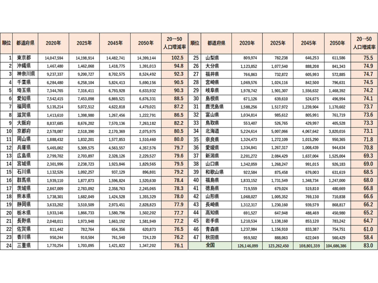 国立社会保障・人口問題研究所が2050年までの地域別人口推計を公表した。