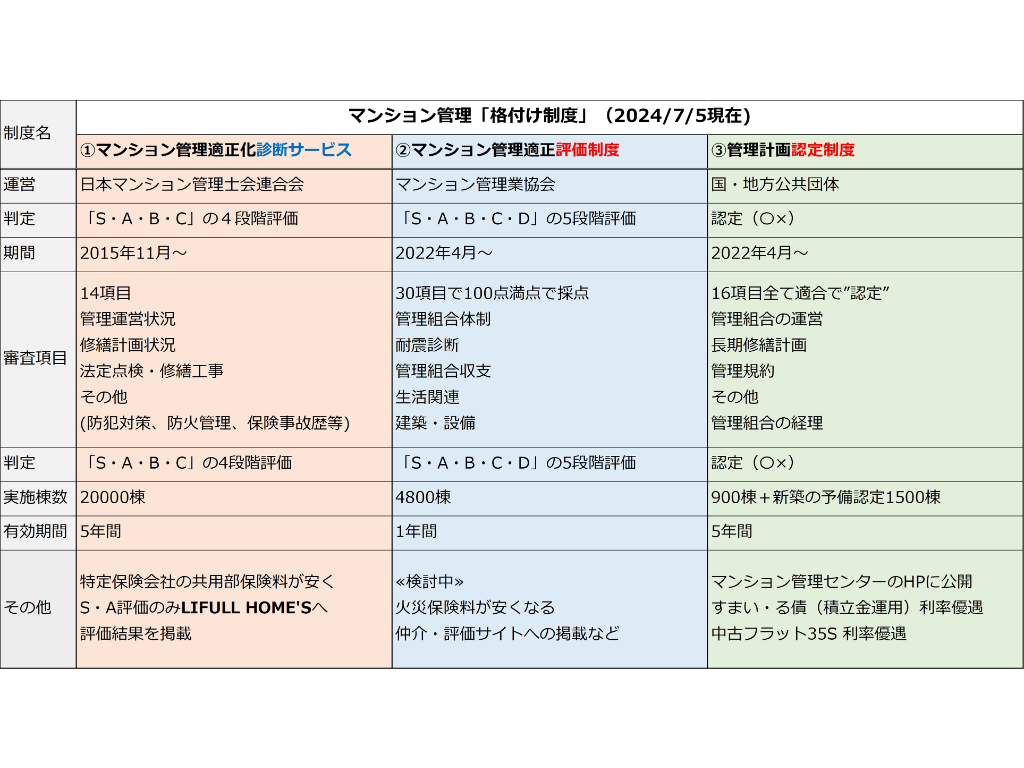 マンションを購入する人や、努力している理事会役員を含むマンション住人については画期的な制度で、客観的・定量的な格付け制度の普及は強く望まれるが3種類もあり、特に②や③は自力・管理会社サポート・管理士サポートなど獲得経路が複数あるため、「どの評価をどの経路で」受ければいいのかが混乱しやすく難しい。各々目的やインセンティブが異なることから、必要なものを選んで格付け評価を獲得していくことになる。各々の概要について下の表にまとめた。筆者の組合ではすべての格付け評価を受けている。