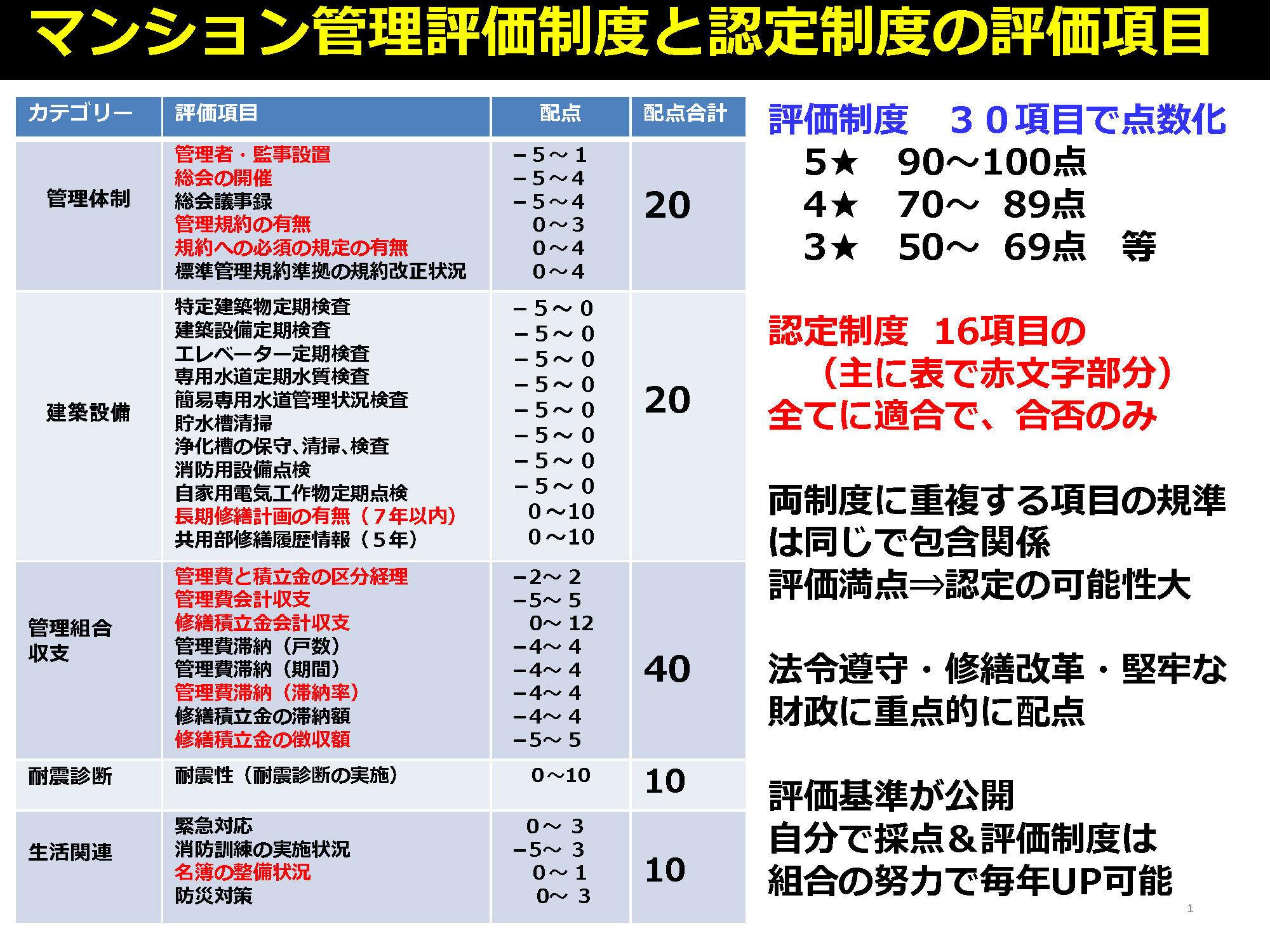 「評価」の点数を毎年見ながら、「認定」の16の評価項目全てクリアできたら、「認定」にも申請を出すのが効果的で、管理会社に委託契約で管理を任せている組合では、理事会が管理会社に任せての評価制度獲得からワンストップ認定取得が普通の筋道になっていくことになるだろうと考える。