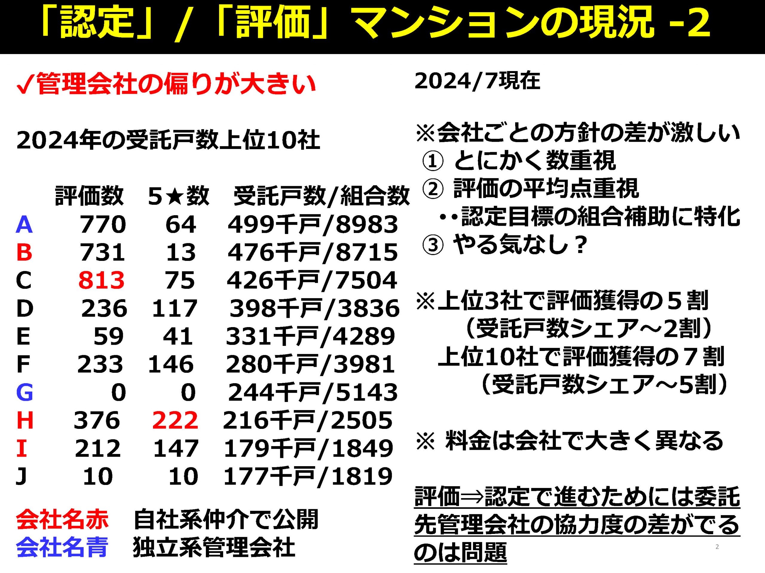 1.マンション格付けは、マンションの戸数や地域などの属性で有利不利がでるのは望ましくない。「認定制度」では自治体独自の17個目の基準を設定する自治体があるが、全国で困難さを同じにするためには17項目目はないことが望ましく、とくに"自治会的な活動”の有無を評価基準とするのは望ましくない。