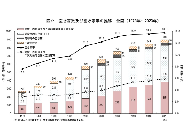 総務省の「住宅・土地統計調査」によると、2023年10月時点の空き家は899万戸(住宅総数に占めるシェア13.8%)で、5年前の調査から50万戸増えて過去最多を記録しており、そのうち使用目的のない放置空き家は385万戸(同5.9%)と同じく36万戸増加しているから、対策は待ったなしの状況だ。