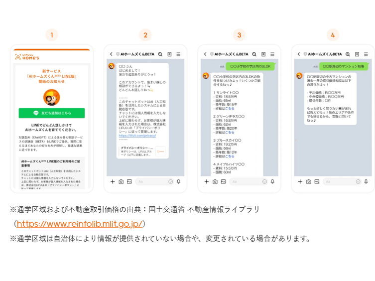 株式会社LIFULLの「AIホームズくんBETA LINE版」では、通学区からの物件検索とエリア毎の不動産取引価格相場の確認が可能となっており、機能の一部に不動産情報ライブラリのAPIが利用されている。