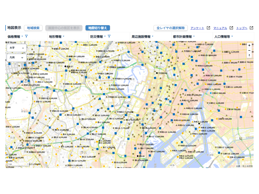 国土交通省では、円滑な不動産取引を促進する観点から、オープンデータ等を活用し、不動産取引の際に参考となる情報(価格、周辺施設、防災、都市計画など)を重ね合わせて表示できるWebGIS「不動産情報ライブラリ」の運用を令和6年4月より行っている。