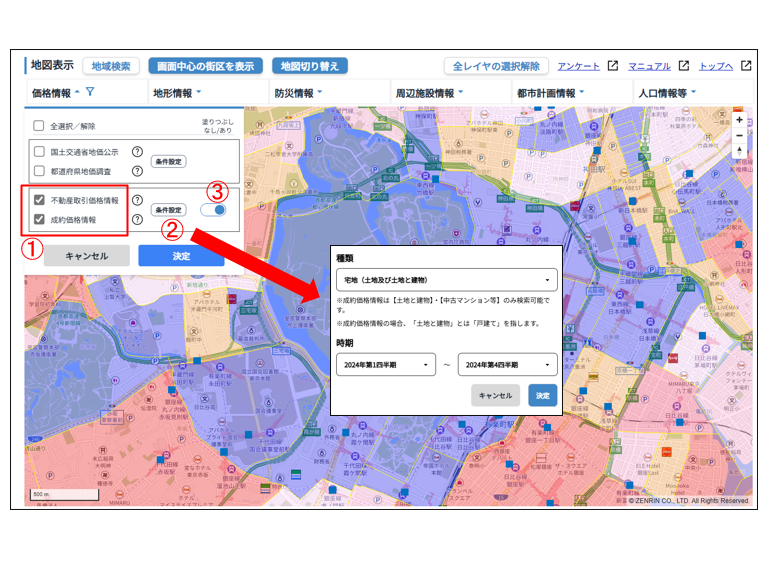 (2)「価格情報」タブで不動産取引価格情報・成約価格情報にチェック(①)し、必要に応じて「条件設定」で種類と時期を選択(②)できる。初期設定では、種類は「宅地(土地及び土地と建物)」が、時期は「2024年第1四半期」~「2024年第4四半期」が選択されている。なお、成約価格情報は、戸建住宅及びマンションの公開としているため、成約価格情報を表示したい場合は、「宅地(土地及び土地と建物)」、「土地と建物」または「中古マンション等」を選択してほしい。