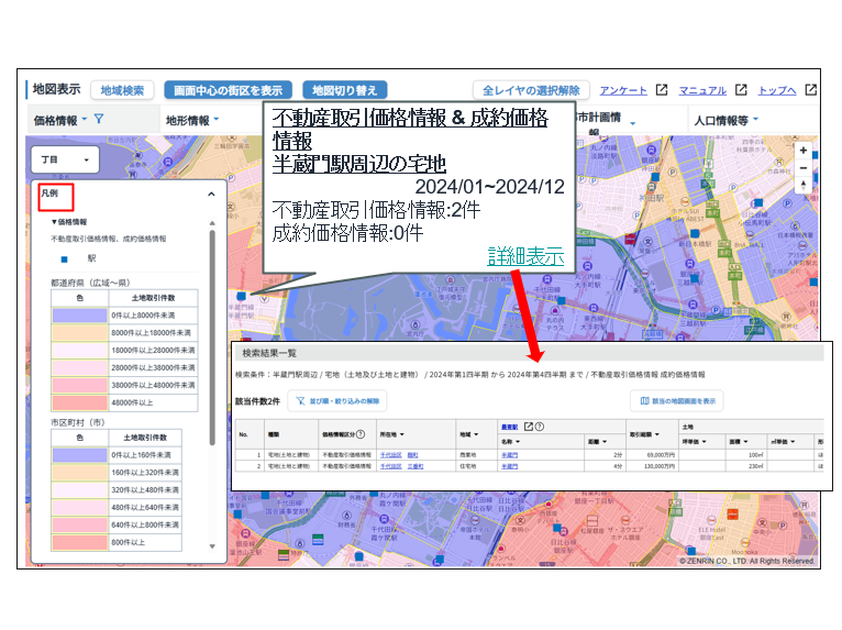 (3)条件設定で設定後、決定を押すと、地図上の駅に青い■が出るほか、地図表示の縮尺に合わせて、都道府県(広域~県)/市区町村(市)/地区(町~詳細)の単位で不動産取引価格情報・成約価格情報が表示される。なお、青い■の駅データは、データの中に「最寄駅」の記載があるもののみが対象となるため、上述した街区単位のデータとは表示される件数が異なることに注意が必要である。(「最寄駅」は必須項目ではないため記載がないデータが存在する。)