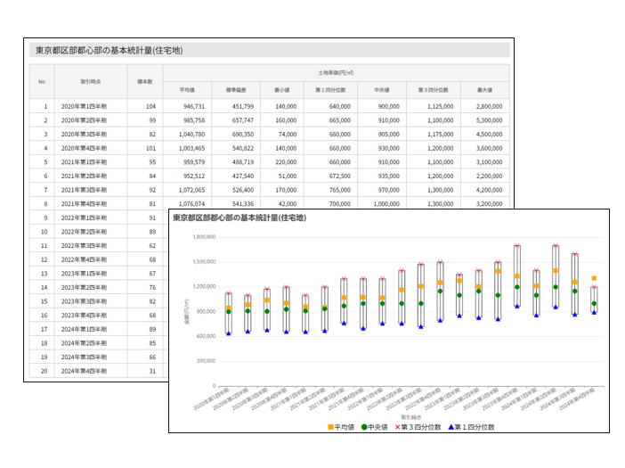 なお、本項目では詳細を割愛するが、「主要都市における土地取引価格の概況」では、2020(令和2年)~2024(令和6年)における、主要都市における土地取引価格の基本統計量(土地面積当たり単価の平均値など)が確認できる。(図7)