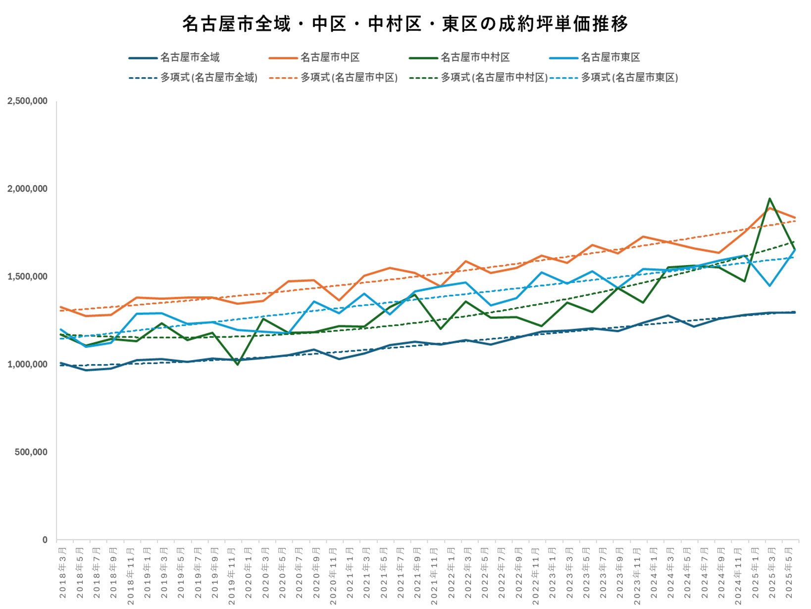 名古屋市において直近で明確に価格上昇を示しているのは、中区・中村区・東区の3エリアである。これは東京23区における都心3区(千代田・中央・港)、あるいは大阪市における北区や中央区のように、「都市の核」となるエリアに投資資金が集まり、価格を押し上げている構図と酷似している。