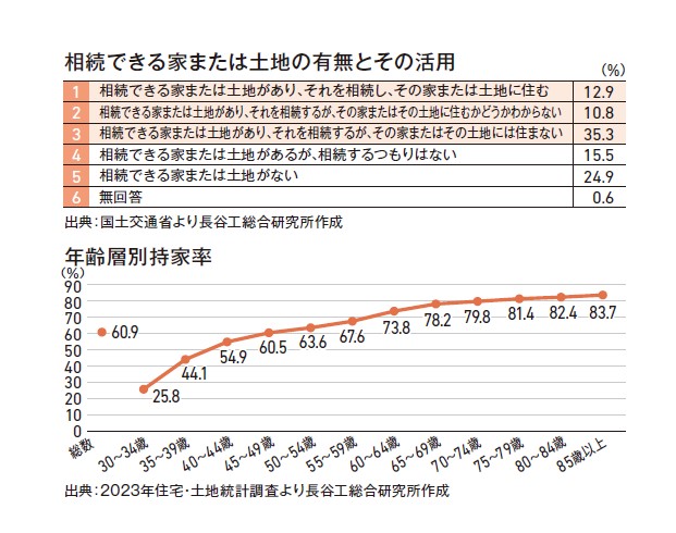 団塊ジュニア世代に対する「相続できる土地の有無とその使い方」を問うアンケート結果では「相続する家・または土地がある」という回答は約75%と高い。現在50代前半となった団塊ジュニア世代の持家率は約63%であるが、親世代である団塊世代は約81%と高く、今後の持家取得として、自ら購入する以外に相続による取得を考える層も一定数存在することが想定される。団塊世代からジュニア世代への不動産相続が不動産市場に与える影響について注視していくことが必要である。