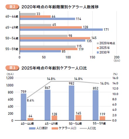 生産年齢人口の減少を背景に、就労と介護を両立する「ビジネスケアラー」の増加が社会的課題として顕在化している。経済産業省によると2030年時点で約9兆1,792億円の経済損失が試算されており、特に仕事と介護の両立困難による労働生産性損失額はその86%ほどを占めることが見込まれている。家族介護者の合計人数は年々増加をしており、ビジネスケアラーの割合は2025年には38%(300万人超)に達する見通しであり、その数は2030年にピークを迎えるとされている(図1)。