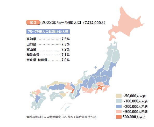 団塊世代が75歳以上となる前後の2018年(図1)と2023年(図2)の人口変化をみると693万2,000人から747万4,000人に54万2,000人増加した。高齢化の進行は地方のほうが取り沙汰されることが多いが、都道府県別にみると、都市部のほうが人口増加が目立つ。こうした高齢化の進行による「年金・医療保険制度への負担」「介護人口の不足」は地方に限らず都市部でも深刻な課題である。「年金・医療保険制度への負担」「介護人口の不足」などの他、様々なサービスへの負担増が懸念されている。