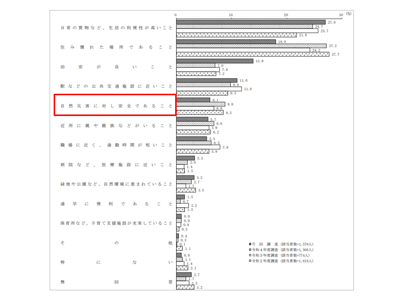 皆さんが住まいを探す上で重要としている情報は何だろうか?国土交通省が毎年行っている「土地問題に関する国民の意識調査」では、生活の利便性、治安に続いて自然災害に対して安全であることが重視されている。(図2)
