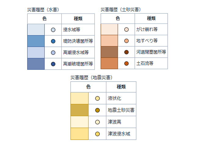 災害履歴図は、この土地履歴調査の成果の一つで、過去に発生した災害の空間的な分布を調査するものである。土地履歴調査の成果には災害履歴図のほかに、土地の成り立ちや改変履歴を表した自然地形・人工地形分類図や土地利用の変遷がわかる土地利用分類図があり、土地固有の災害リスクに関する基礎的な地理空間情報として整備するものである。
